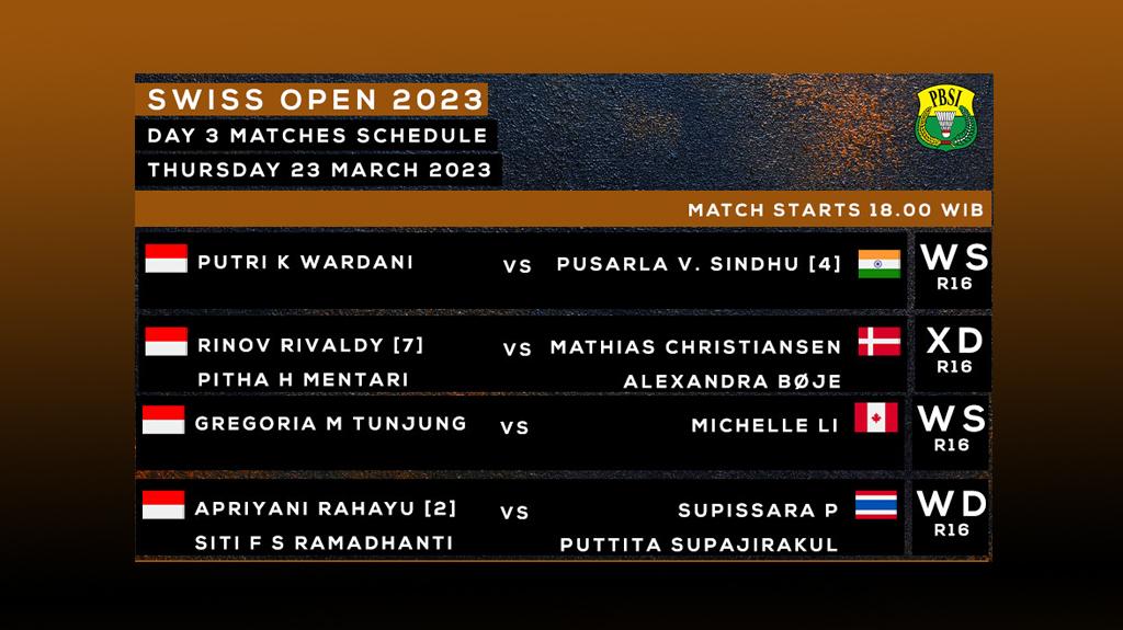 Babak 16 besar Swiss Open 2023 akan berlangsung di St. Jakobshalle, Basel, Kamis (23/3/2023) mulai pukul 18.00 WIB.