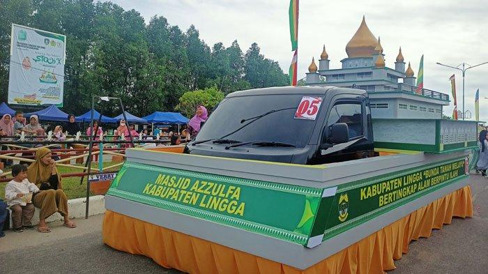 Seperti salah satunya yang menarik perhatian, yakni mobil hias dengan miniatur Masjid Azzulfa yang kafilah Lingga.