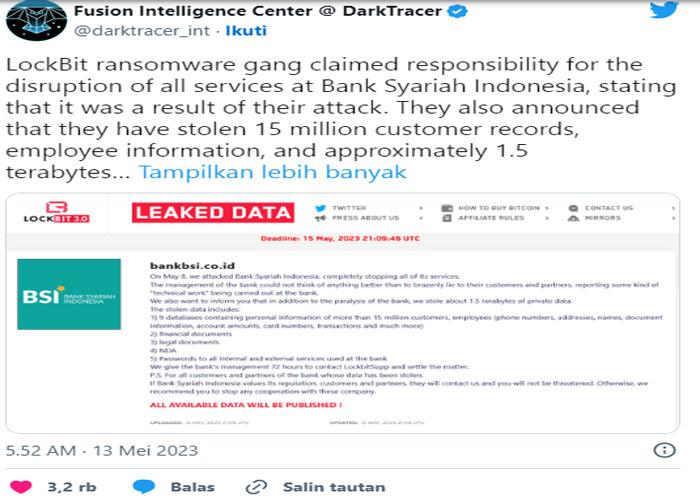 “Kelompok ransomware LockBit mengaku bertanggung jawab atas gangguan layanan di Bank Syariah Indonesia (BSI). (Mereka) menyatakan bahwa itu (gangguan) adalah akibat dari serangan mereka. Manajemen bank tidak punya alasan yang lebih baik selain berbohong kepada nasabah dan mitra perusahaan, yakni melaporkan adanya sejenis “masalah teknis” yang sedang dilakukan oleh bank,” tulis Dark Tracer.