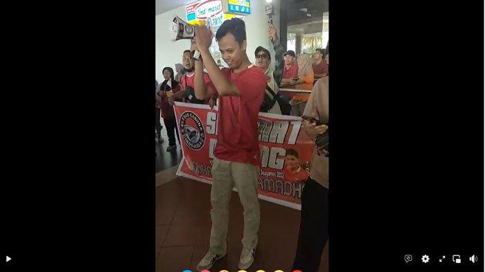 Mereka membawa spanduk bertuliskan Selamat Datang Muhammad Ramadhan Sananta Sepak Bola, peraih medali emas-Sea Games Kamboja 2023.