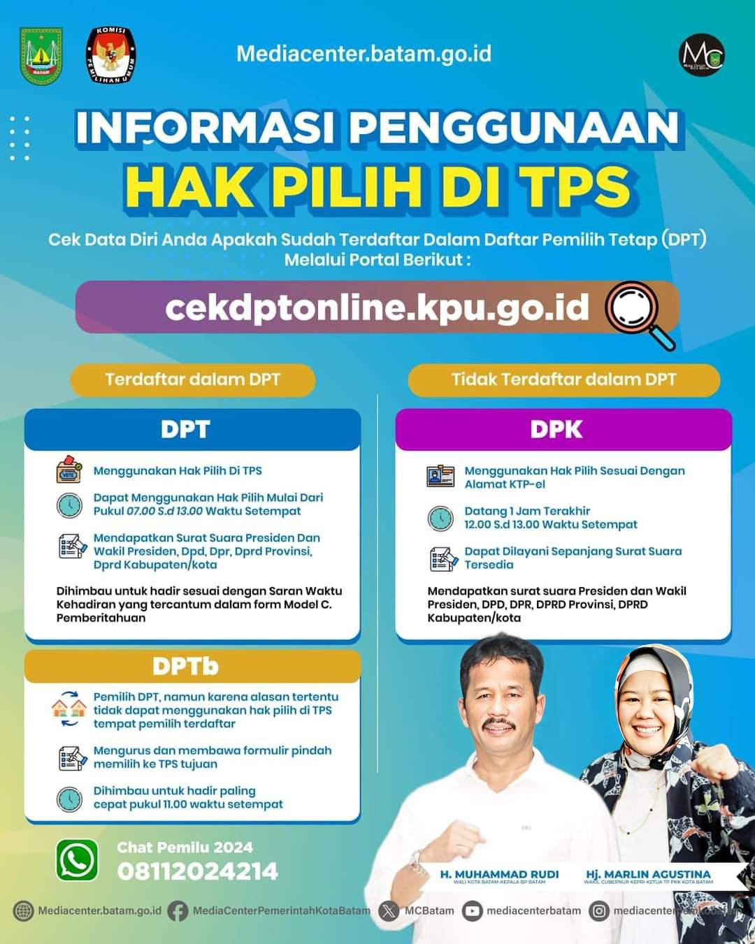 Dinas Informasi dan Komunikasi Kota Batam, melalui akun Instagram resmi turut, memberikan informasi seputar penggunaan hak pilih di Tempat Pemungutan Suara (TPS) bagi warga Batam.