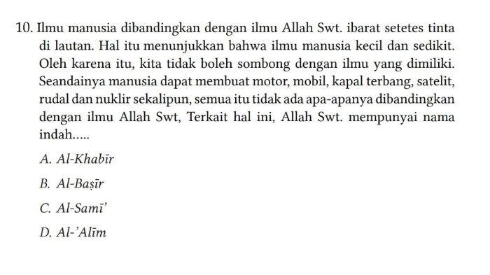 Siswa akan diminta untuk menjawab soal pilihan ganda: Ilmu manusia dibandingkan dengan ilmu Allah SWT ibarat setetes tinta di lautan.