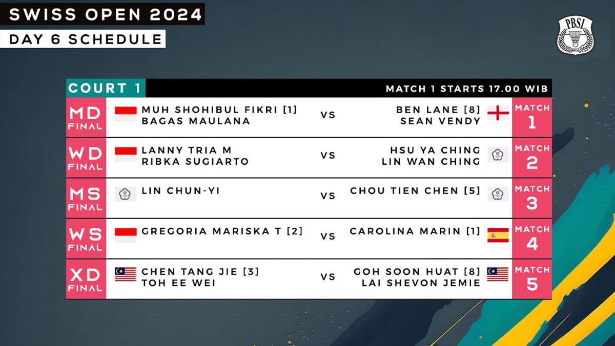 Jadwal Final Swiss Open 2024 live iNews TV, Fikri/Bagas vs Ben Lane/Sean Vendy, Gregoria vs Carolina Marin, Lanny/Ribka vs Hsu Ya Ching/Lin Wan Ching