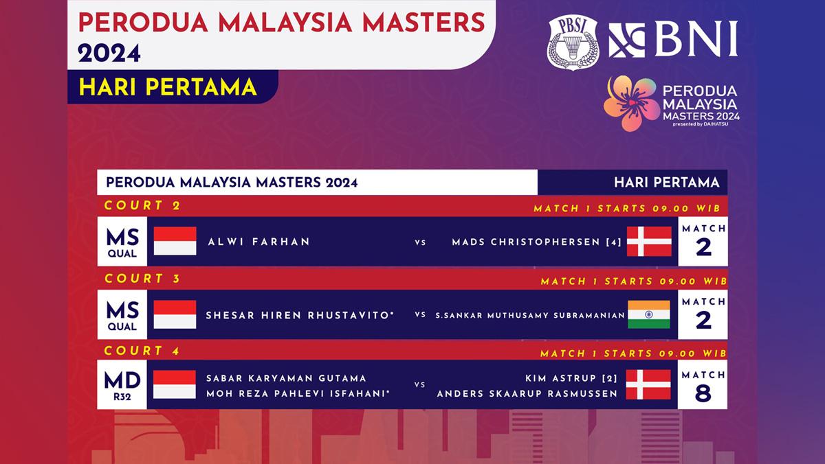 Hari ini, ada tiga wakil Indonesia yang akan bermain, dua di babak kualifikasi dan satu lainnya di babak utama 32 besar Malaysia Masters 2024.