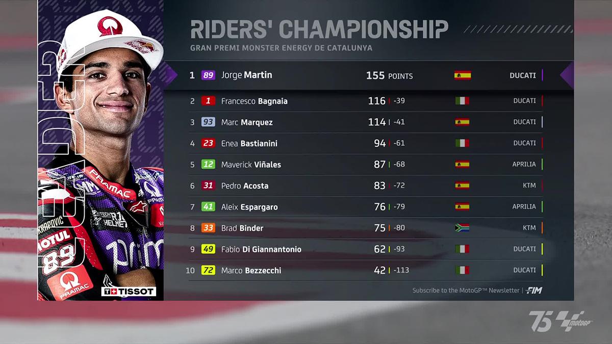 Namun, tambahan 25 yang diraih Francesco Bagnaia dari kemenangan di Catalunya itu membuat jarak keduanya kini terpangkas menjadi 39 poin dari 41 poin sehari sebelumnya setelah Sprint Race.