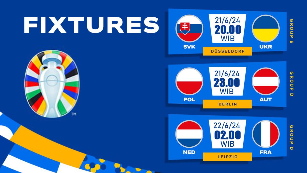 Jadwal Piala Eropa 2024 Hari Jumat (21/6/2024) ini pukul 20.00 WIB Slovakia vs Ukraina, 23.00 WIB Polandia vs Austria, 02.00 WIB Belanda vs Prancis