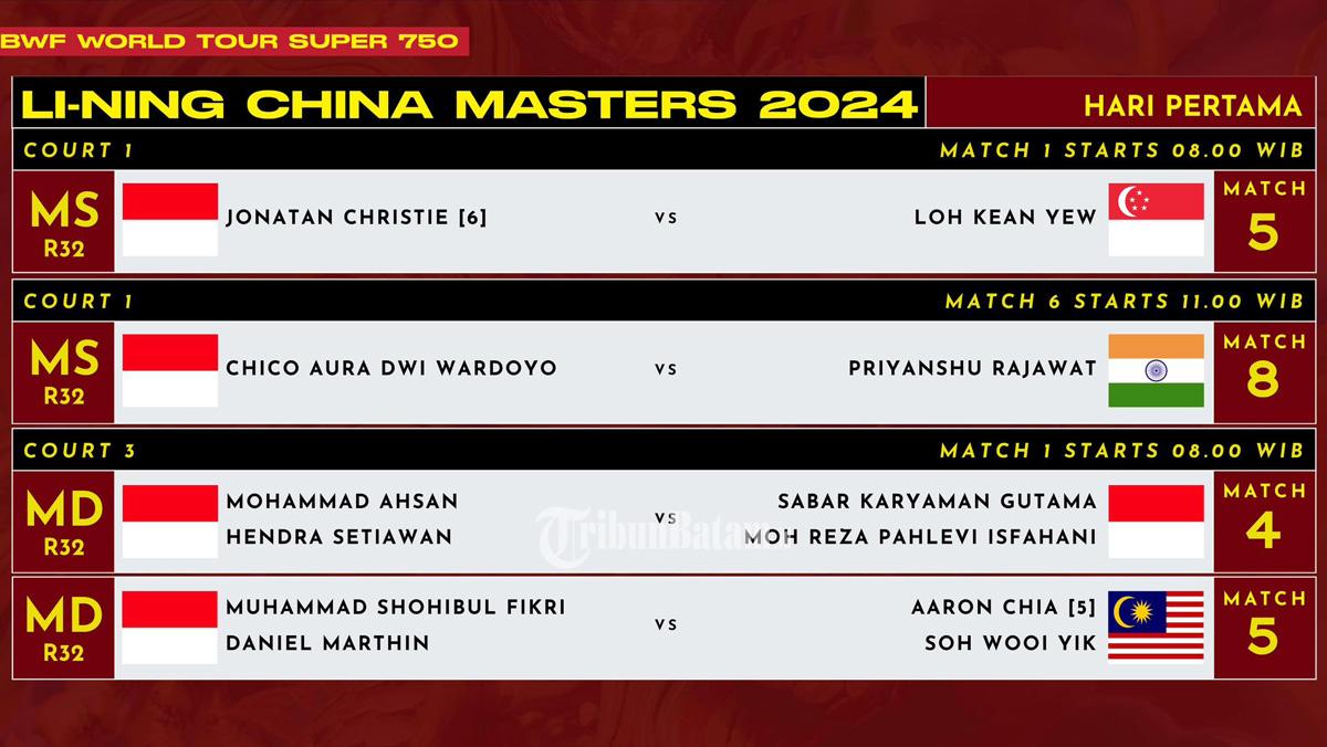 Ada lima wakil Indonesia yang akan bermain di hari pertama babak 32 besar China Masters 2024 yang berlangsung di Shenzhen, China ini.