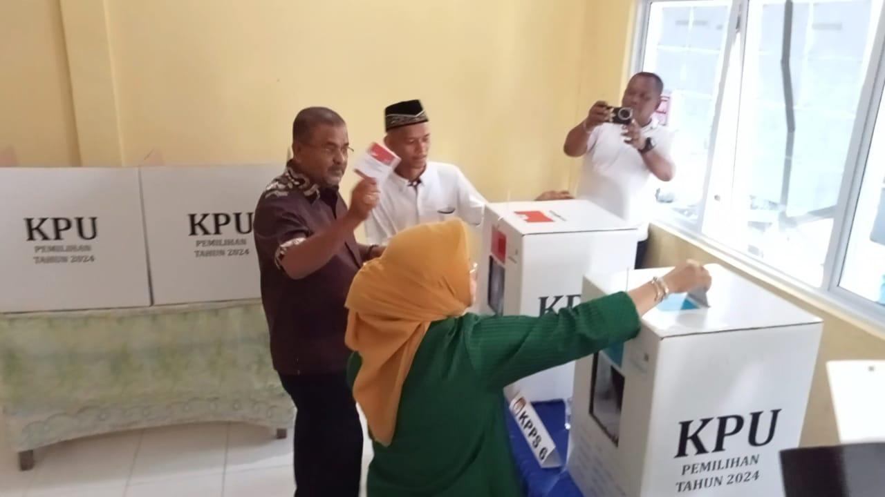 TRIBUNBATAM.id, KARIMUN - Calon Wakil Gubernur Kepri Aunur Rafiq didampingi istri Raja Azmah mencoblos di TPS 008 Kelurahan Sungai Lakam Barat, Kecamatan Karimun, Rabu (27/11/2024).