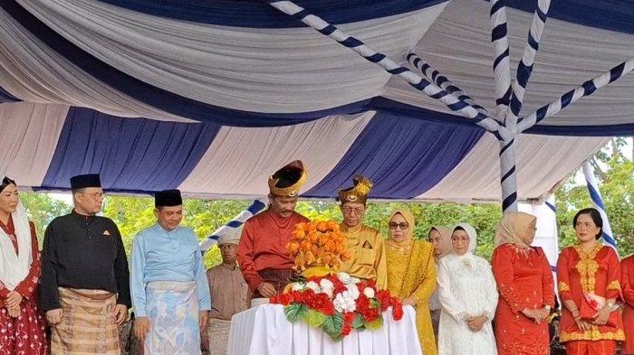 Mengenakan baju kurung Melayu berwarna merah, songket coklat dan tanjak, Wali kota Batam Muhammad Rudi bertugas sebagai inspektrur upacara.