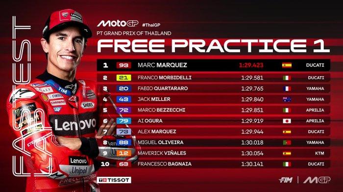Hasil FP1 MotoGP Thailand 2025 Marc Marquez Tercepat, Fabio Quartararo Urutan 3, Pecco Bagnaia No 10