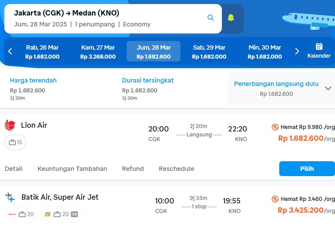 Berikut daftar maskapai yang menyediakan jasa penerbangan Jakarta Medan pada tanggal 28 dan 29 Maret 2025 beserta harga tiket per orang.