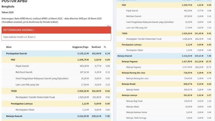 APBD 2025 untuk Provinsi Bengkulu sendiri yakni 3,135 Triliun (Pendapatan), 3,212 Triliun (Belanja) dan 0,00 M (Pembiayaan).