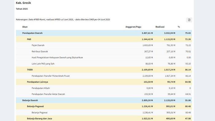 Berikut rincian Pendapatan dan Belanja APBD Kab Gresik Provinsi Jatim sampai Juni 2025 dilansir dari data DJPK Kemenkeu RI.