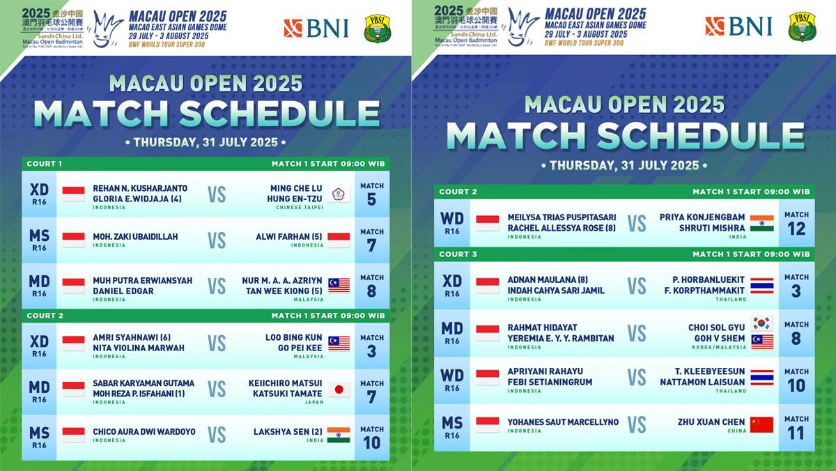 Babak 16 besar Macau Open 2025 berlangsung di Macao East Asian Games Dome, Cotai, Macau, Kamis (31/7/2025) pagi mulai pukul 09.00 WIB.