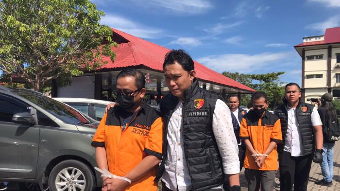 Dengan tangan diborgol, para tersangka mengenakan rompi tahanan Tipikor Polda Kepri.