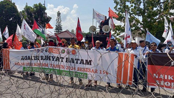 Buruh di Batam kembali unjuk rasa di depan Kantor Pemko Batam hari ini. Buruh minta UMK Batam 2024 naik jadi Rp 5 juta