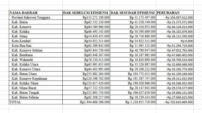 Daftar Dana Alokasi Khusus ( DAK ) Fisik 2025 Sulawesi Tenggara 2025 dipangkas Rp 725.810.869.000 terkait Inpres Nomor 1 Tahun 2025 Tentang Efisiensi