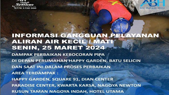 Air Batam Hilir menginformasikan sejumlah wilayah terdampak mati air di Batam hari ini selain Perumahan Happy Garden, Senin (25/3/2024).