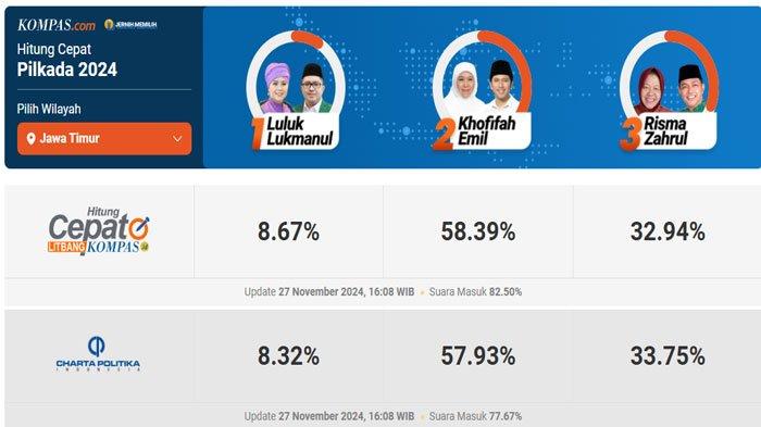 Hasil Quick Count Pilgub Jawa Timur 2024, Kawal Hasil Suara Jatim Luluk Vs Khofifah Vs Rismaharini