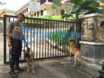 Setidaknya tampak dua ekor anjing pelacak dibawa polisi dan mobil water canon berjaga-jaga di kantor KPU tersebut