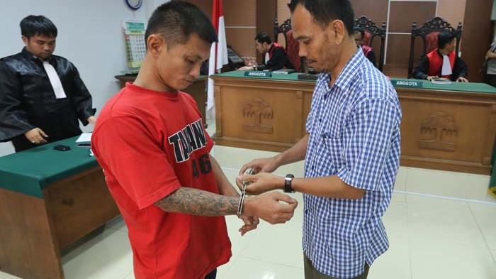 Terdakwa pembunuhan sadis Aprilian Dewi, seorang model sekaligus siswi SMK Permata Harapan, Asen terlihat puas saat sidang vonisnya berakhir.